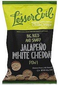 The best deal with Snack Food Chips. The Lesser Evil Jalapeno White Cheddar Chia Crisps 4oz Product Description of Lesser Evil Chia CrispsAll natural No trans fat Gluten free Cholesterol free Not genetically modified Good source of fiber Lesser Evil Chia Crisps are a delicious way to snack healthy.