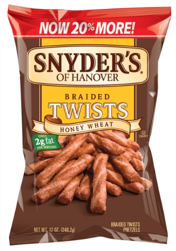 The best products with Snack Food Pretzels. The Snyder's of Hanover Pretzels Twists, Honey Wheat Braided Pretzel, 12 Ounce (Pack of 12) A slightly sweet and salty combination of whole wheat, honey and sesame seed flavors that literally melt in your mouth. Snyder's of Hanover Pretzels Twists, Honey Wheat Braided Pretzel, 12 Ounce (Pack of 12) Snack Food Pretzels